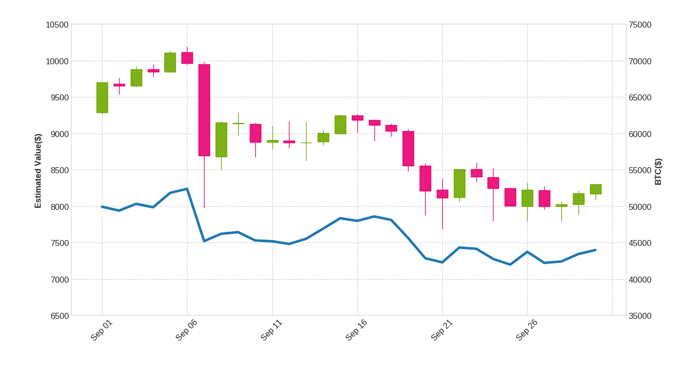 ローソク足が評価額。青のラインが参考のBTC価格です。